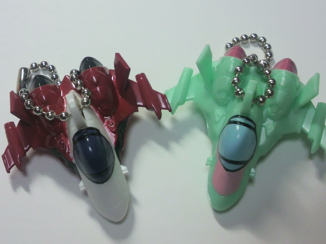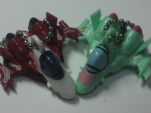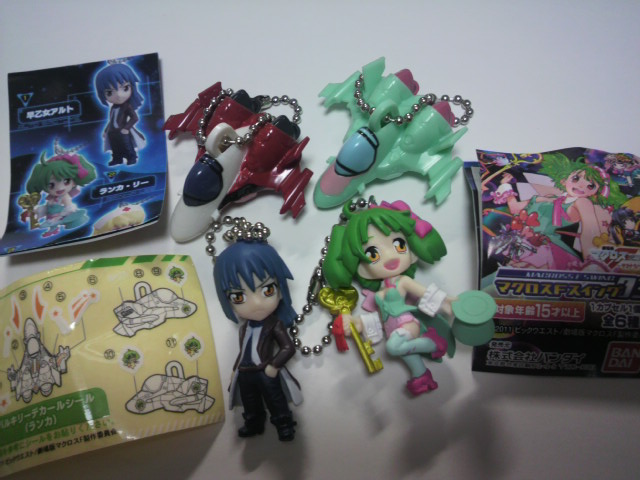 本当はもう一つのピンズっぽいキーホルダーの方が可愛いのでやってみたかったのですが、無かったので発見したマクロスFスイングをガチャガチャ・・ランカちゃんとランカちゃんデカールのバルキリーが1個ずつ重なりましたが、結構いい確率で入手出来ました。ばっちりアルラン揃えました!