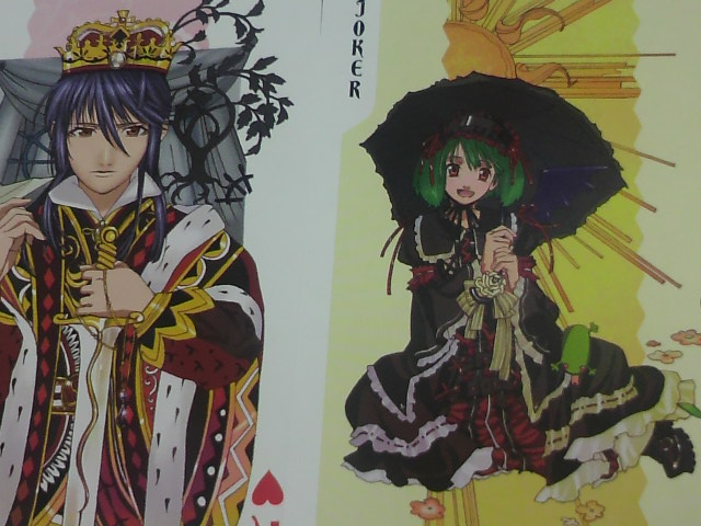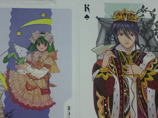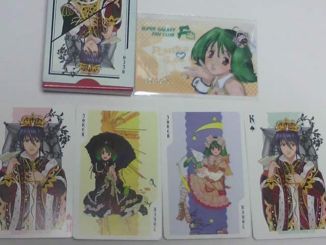 このトランプ、アルトがキングでクイーンがシェリルさんでジャックがミハエルってとこがちょーーーっと気に入りませんが、ジョーカーなランカちゃんが可愛い上にランカちゃんだけ2柄あるということで、相殺という事にしておきましょう・・・。個人的にはランカちゃんとシェリルさんでクイーンは2枚づつ、ジョーカーは1枚づつとかにして欲しかったなぁ・・とりあえずうちのアルトとランカは並べておきます^^